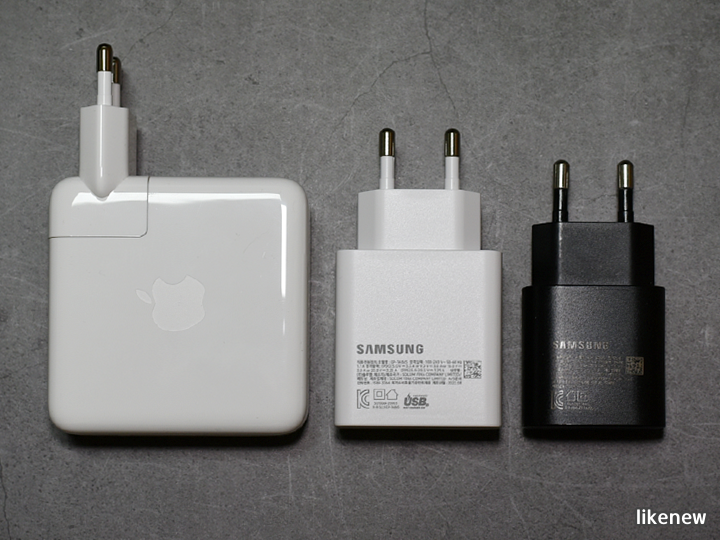 ▲ 왼쪽부터 맥북 프로 14 충전기, 갤럭시 북2 Pro 충전기, 삼성 고속 충전기