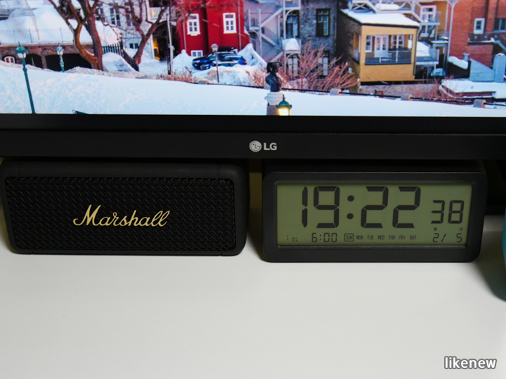 탁상시계 크기는 가로 14.5cm, 높이 6.6cm인데 블루투스 스피커, 마샬 엠버튼 크기와 비슷해 나란히 놓으면 균형이 맞아 보기 좋다.